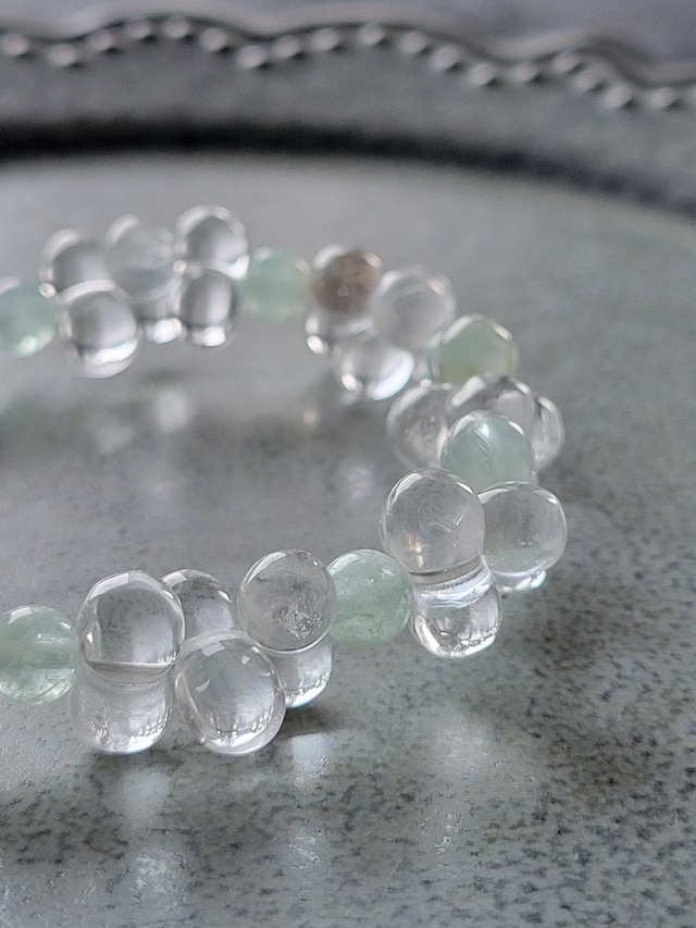 【天然石 水晶とグリーンフローライト】 希少な水晶のファルファーレビーズと グリーンフローライトを使用した、まるで自然の中から取り出したかのような素朴で上品なブレスレットをお仕立てしました つぶつぶの立体感が可愛く、どんなコーディネートにも合わせやすいアイテムです グリーンフローライトは、心身の浄化や調和を促進するとされ、リラックスした気持ちをもたらしてくれる効果があると言われています 水晶はクリアなエネルギーを持ち、ポジティブな 思考をサポートしてくれるといわれています 身につけるかたの日常をより豊かに♡ ■ カラー 透明(クリア)× 緑(フローライト) ■ 素材 天然石 / 水晶、グリーンフローライト ■ サイズ 内径 約15.5cm (ご希望のサイズがございましたら 備考欄にご記載ください) ■ お手入れ/取り扱い注意事項 柔らかい布で優しく拭き取ることをおすすめします。高温多湿や直射日光を避けて保管してください ■ 発送・注文に関する情報や注意事項 ご注文後、通常3~5営業日以内に発送いたします 特別なご要望がございましたら、お気軽にご相談ください ■ ご購入の際の注意事項 色味や形状に個体差がございます この違いも天然素材の魅力としてお楽しみいただければ幸いです 【発送について】 *ご入金後、土日を除く5日以内に発送いたします。 *ネコポスでの発送となり、ポスト投函でのお届けです。出荷日・着日の指定はできませんのでご了承ください。 *ご登録住所に誤りがあり返送された場合、再送は着払いで対応させていただきます。 【返品・交換について】 *ご購入確定後のご注文内容変更は承っておりません。ご注文内容をよくご確認のうえご購入ください。 *初期不良(パーツ取れ等)の場合のみ、商品発送日から7日以内にご連絡いただければ修理または交換対応いたします。 *初期不良以外の返品・交換は致しかねます。 【作品について】 *ご利用の端末環境により色味が異なる場合があります。ご不安な場合はご購入前にお問い合わせください。 *繊細な作りですので強い衝撃で破損する場合があります。 *小さなお子様やペットによる誤飲には十分ご注意ください。誤飲等による事故については責任を負いかねます。 【ご購入について】 *お取引相手としてふさわしくないと判断した場合、キャンセルさせていただくことがあります。 #水晶 #グリーンフローライト #天然石 #ブレスレット #アクセサリー #デイリーコーデ #ハンドメイド #おしゃれ #ファッション #ヒーリング #透明感